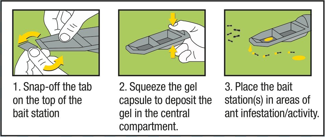 the gel in the central compartment; Place the bait station(s) in areas of ant infestation/activity