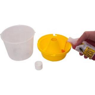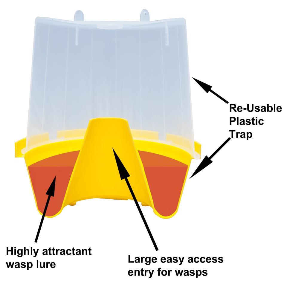 Wasps are attracted to the trap by the organic pheromone lure and enter through the inverted funnel in the trap’s base. The wasps then become trapped in the liquid and die.
